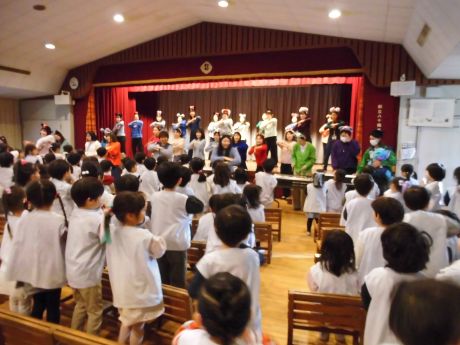 2月の誕生会のお楽しみはお家の方による有志の集まり『こけっこくらぶ』の発表会。幼稚園のみんなが喜んでくれるように、工夫を凝らした準備をしてくれていました。始めは『さんぽ』の曲を合奏しながらの入場です。いろいろな楽器を使った楽しい入場に子どもたちも大喜び。