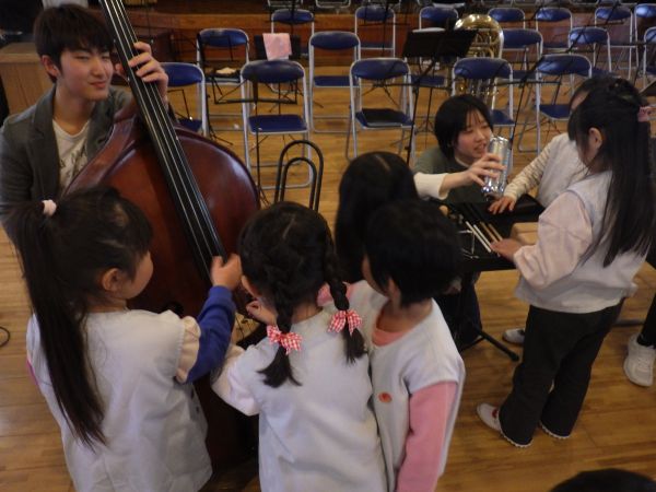 演奏が終わった後には、年長さんが楽器のふれあい体験をさせてもらいました。普段なかなか触る機会のない楽器に大興奮の子どもたちでした。