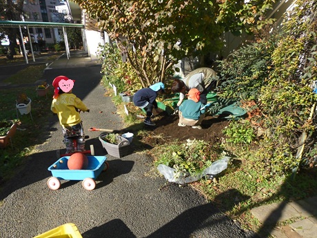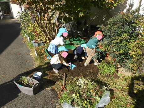 この頃花が咲かなくなってきた…と養護の先生。どうやら幼虫に根をかじられているようです。そこで、作り直そう!ということで、大工事(?)が始まったのでした。